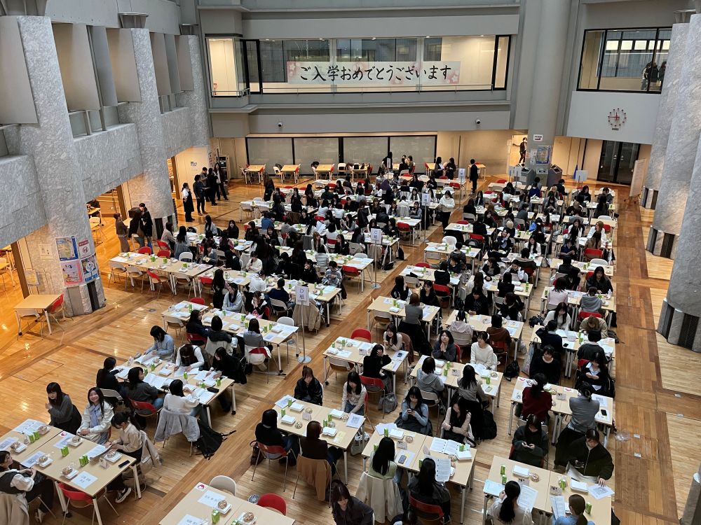 アトリウムにあるコタカキッチンでのランチ交流会を通して、新入生たちは比較文化学部の教員やクラスメートと初めて交流を持ちました。