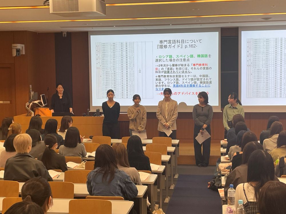 比較文化学部は第二外国語の学習を重視しています。多くの新入生たちは英語以外の外国語を本格的に学んだことがなく、どの外国語を履修すればいいか戸惑いを感じていたようです。そこで、今回のガイダンスのアシスタントをつとめてくれた5人の在校生たちが、わかりやすい語り口で第二外国語の魅力や選択の基準を伝えてくれました。在校生の皆さん、ありがとうございます。